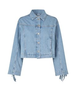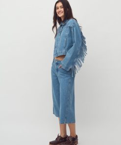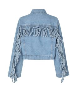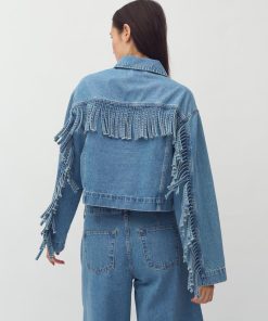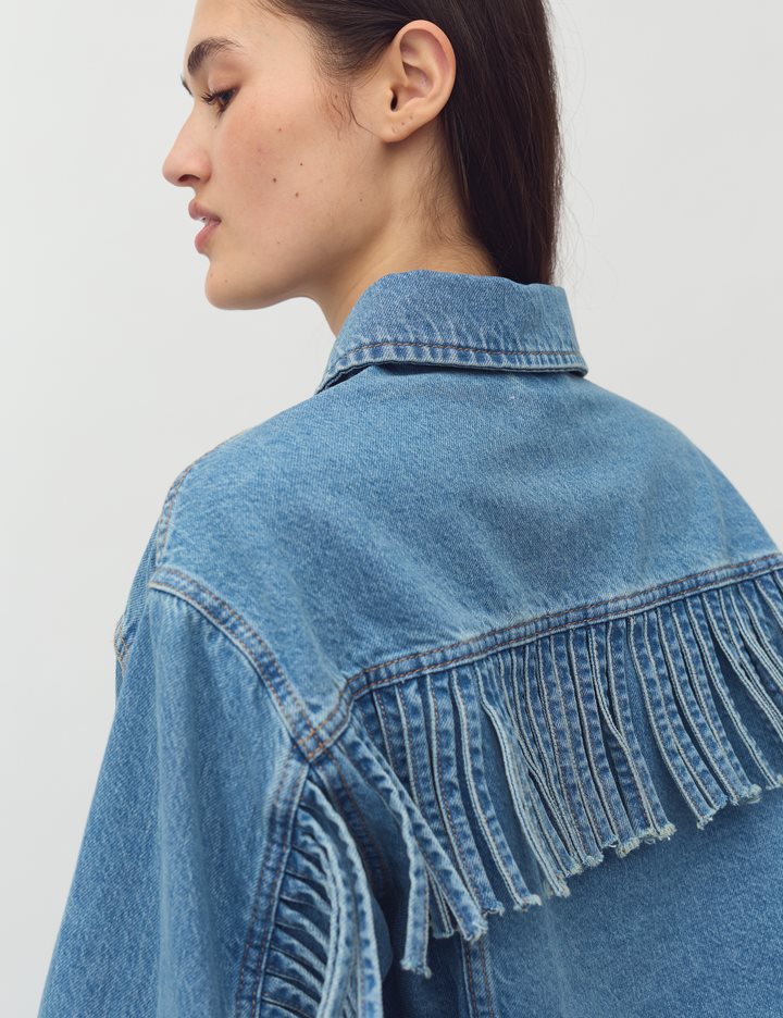 Denim jacket with fringes.- Material: 100% Cotton- Loose fit- Short length- Fringes on sleeves and back- Side pocketsThe model is 176 cm and is wearing size S.