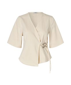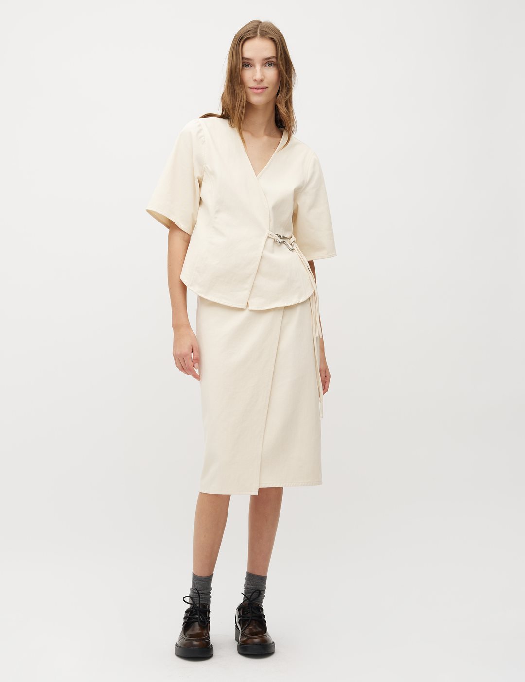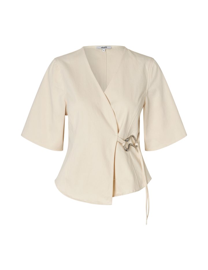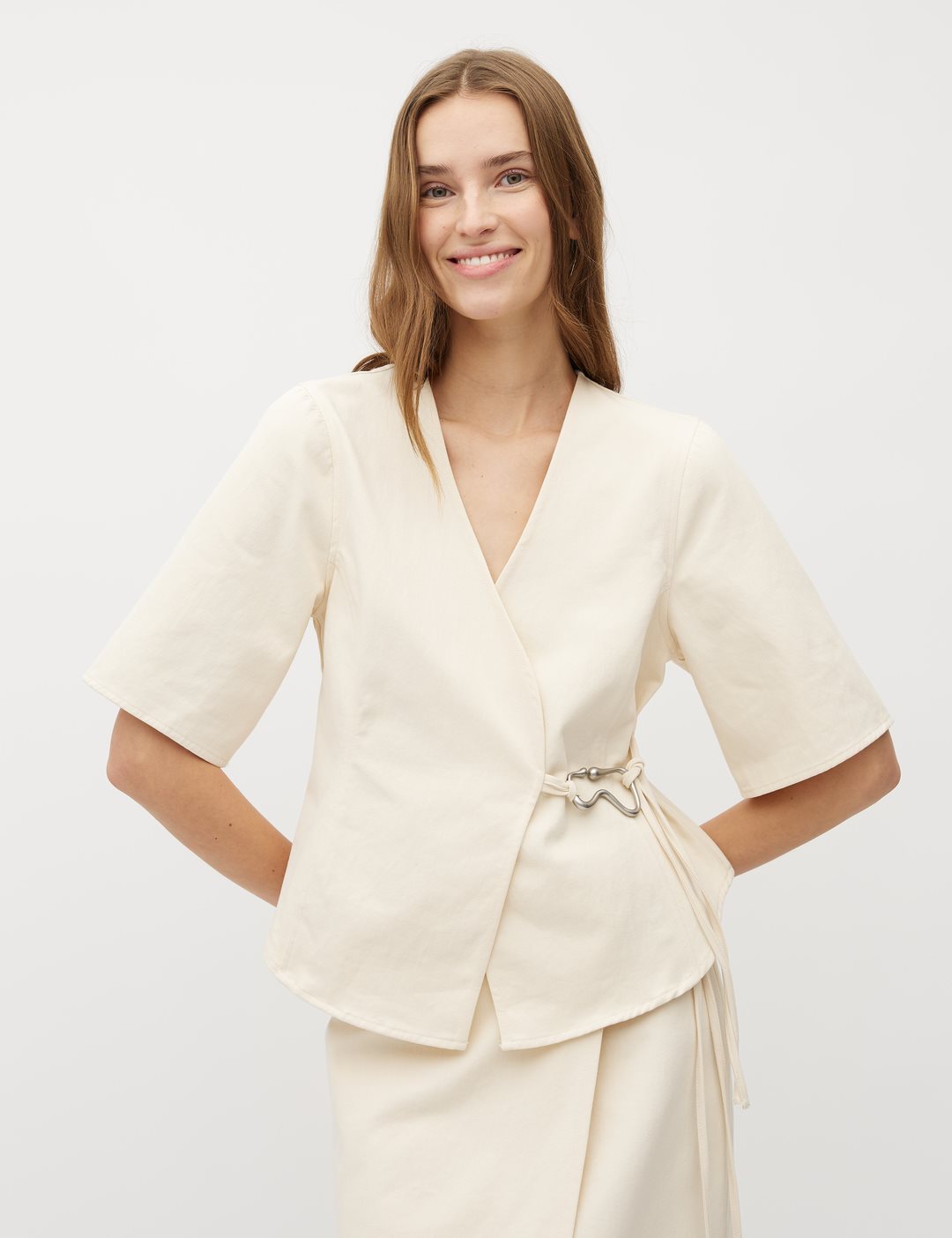Wrap blouse with belt buckle.- Material: 100% Cotton- Wrap- V-neck- 3/4 sleeves- Regular lengthThe model's height is 176 cm and she is wearing a size S.